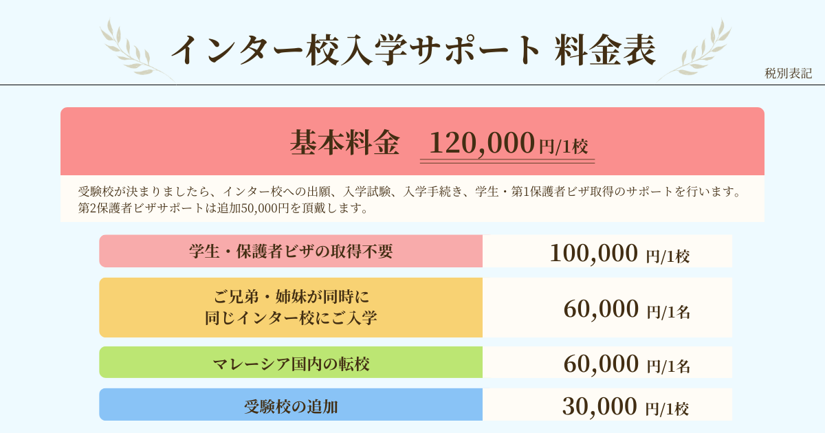 ※日本大使館までの往復の交通費、インター校(1校)への送付料は含まれます。