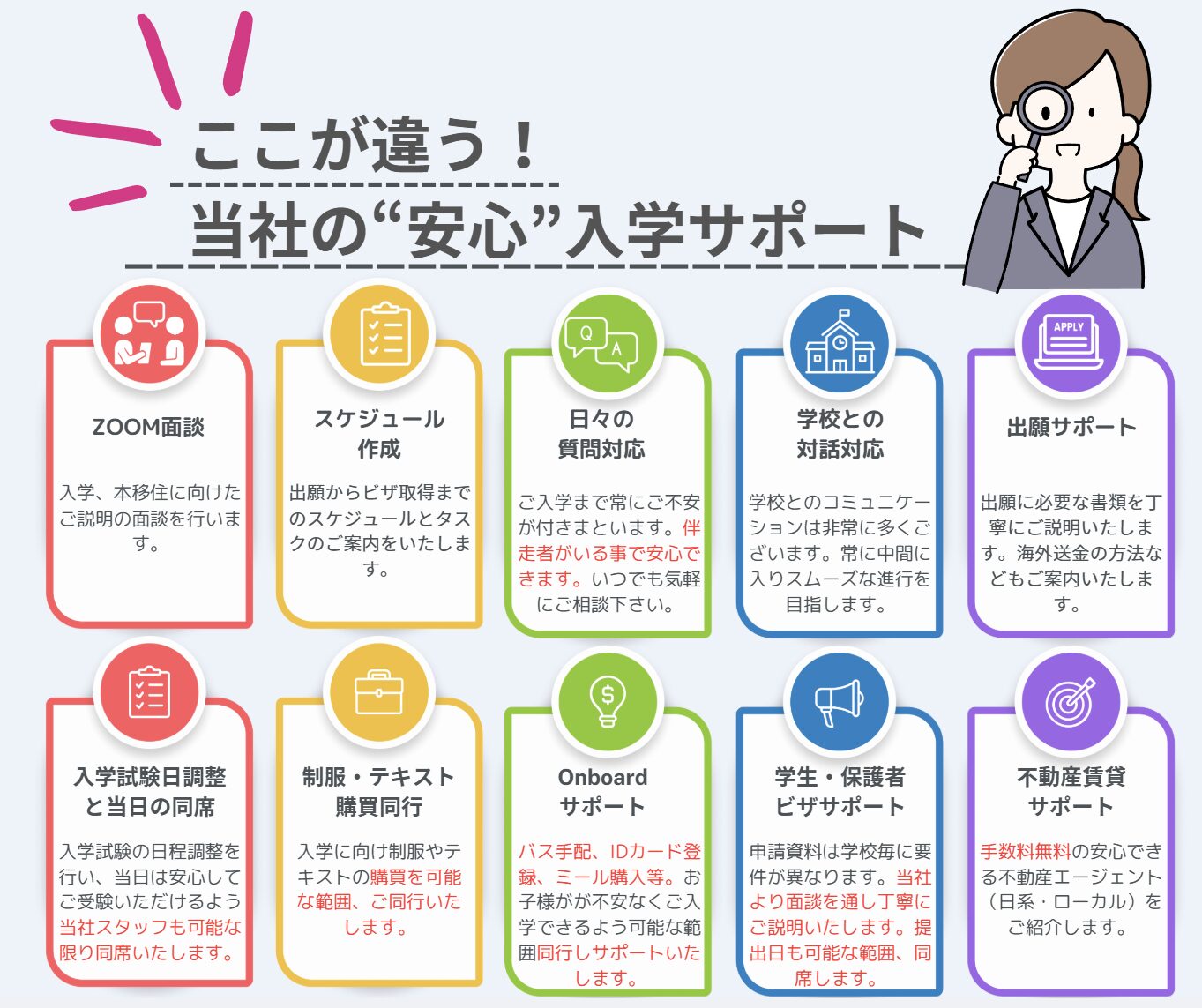 「制服購買」や「Onboardサポート」「不動産賃貸サポート」が含まれていない入学サポートの提供が多い中、当社はすべてワンストップで提供しております。お客様がご不安に思うところまでしっかりカバーしております。
