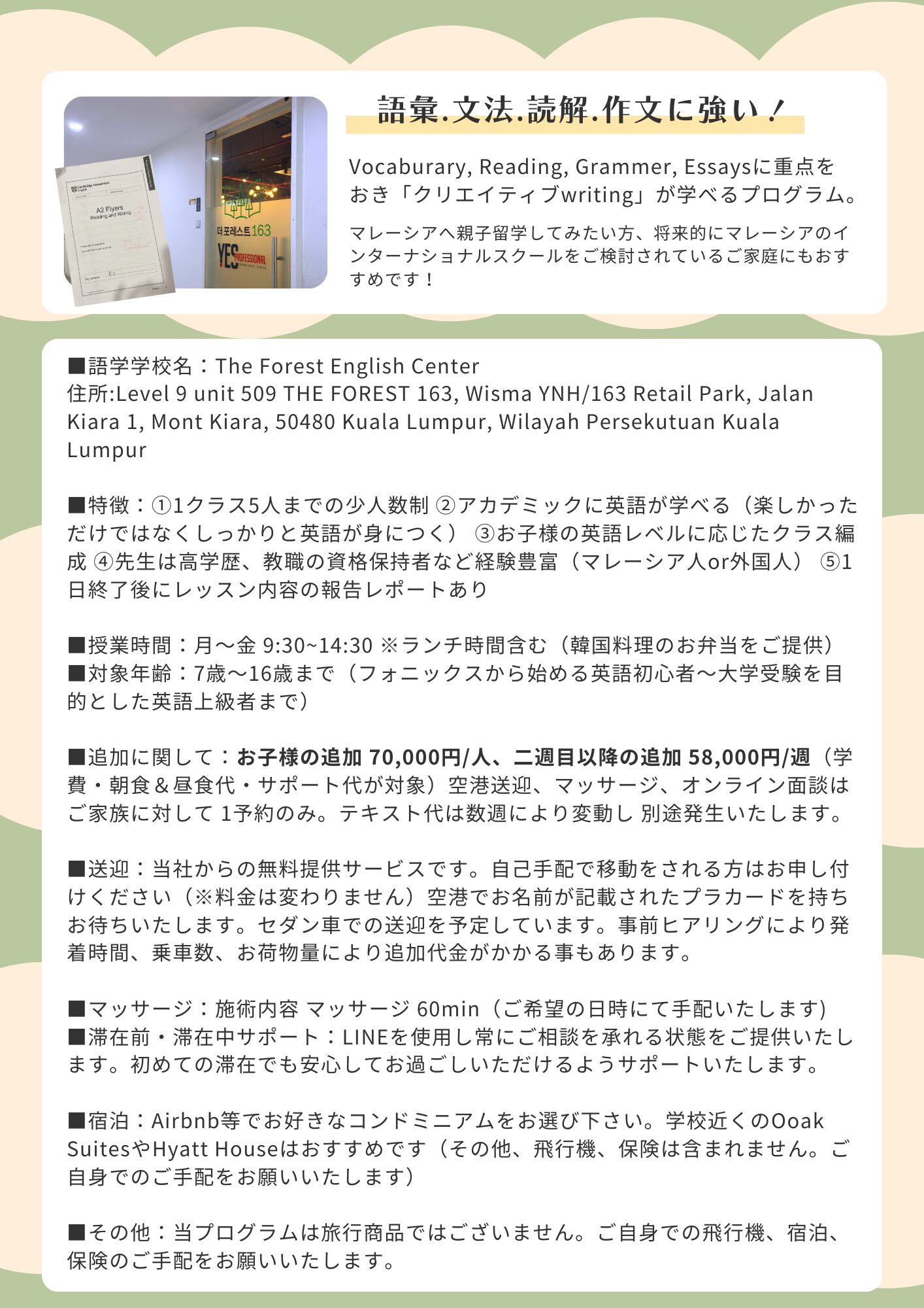 現地インターナショナルスクールに通うお子様にも人気の「The Forest English Center」とのお得なセットパッケージです。